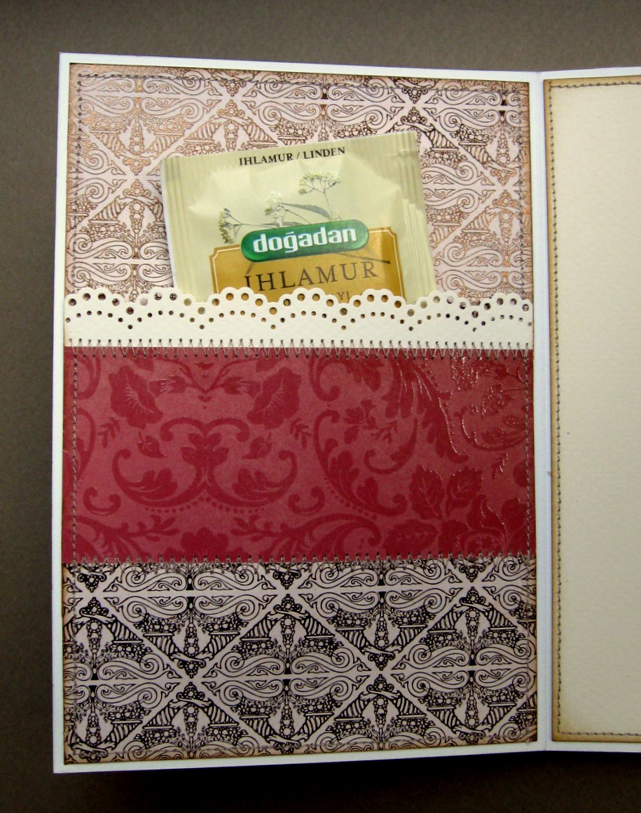 Открытку я сделала специально по заданию о Vintage Cafe Card Challenge "Чайные церемонии", где можно было использовать любые атрибуты чаепития: чайнички, чашки, блюдечки, ложечки и др.